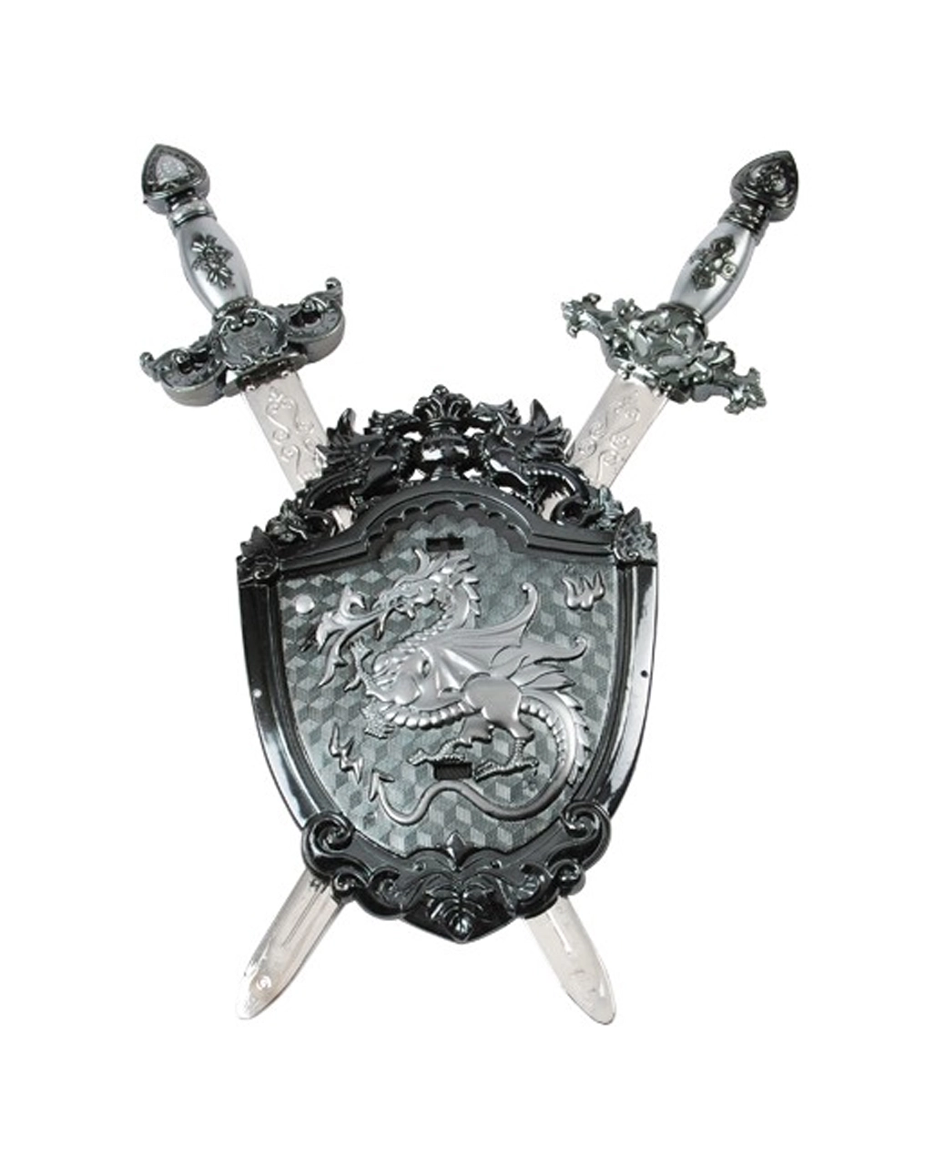 Die 2 Schwerter mit Drachen Schild bestechen durch ein geniales Design. In Silber und Grau gehalten, sorgen Verzierungen in Form von Kreuzen, Krone und verschlungenen Symbolen auf den Spielzeug-Schwertern für die richtige Fantasy-Stimmung. Stilisierte Blutrinnen sowie eine Länge von ca. 48cm unterstreichen die realistische Optik. Ein großer, silberner, Feuer speiender Drache prangt als Wappentier auf dem Ritter-Schild, welches zusätzlich mit kleineren Zierdrachen oben auf dem Rand geschmückt ist. Mit einem Riemen auf der Rückseite des Faschings-Kostüm-Accessoires kannst du den Schild bequem im Kampf führen. Noch mehr Spielzeugwaffen für Kinder & Erwachsene wie das Ringgeister Klinge und den 45cm Rundschild mit Löwenkopf haben wir ebenfalls im Karneval-Universe.de!