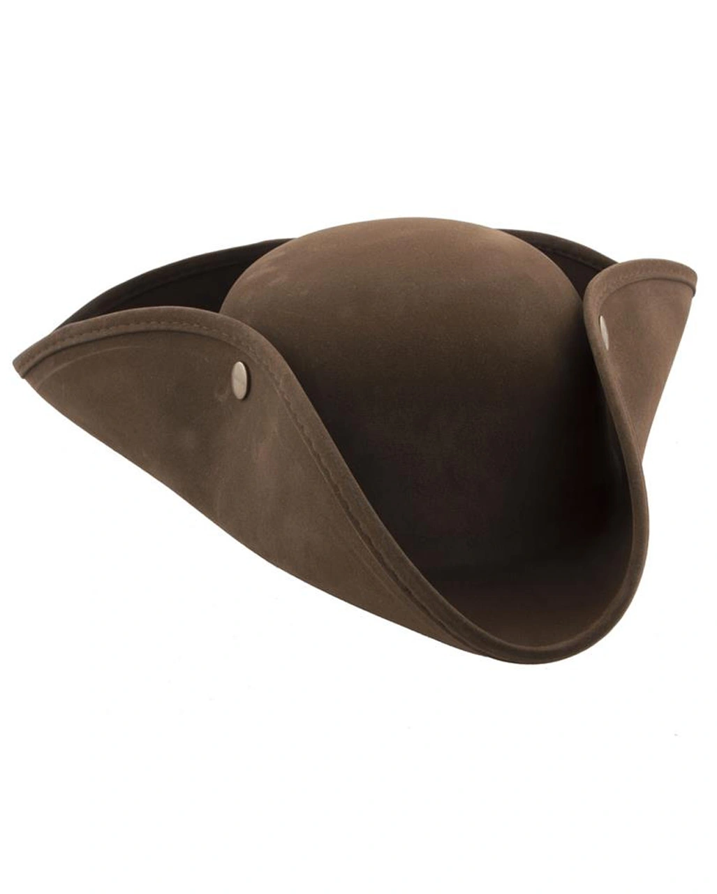Unser schöne Dreispitz besteht komplett aus braunen Kunstleder, in Wildleder Optik, dessen Seiten mittels Druckknöpfe gelockert werden können. Die Hutgröße des Piratenhuts beträgt 57/58.
