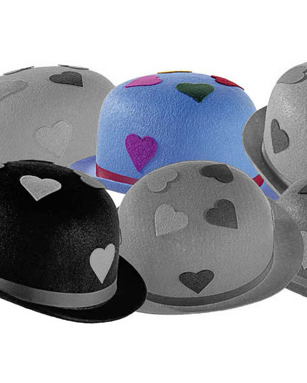 Hellblauer, schriller Partyhut aus Filz mit vielen bunten Herzen. Der hellblaue Partyhut in Form einer klassischen Melone ist der Hammer unter den Karnevalshüten und wird immer wieder gerne aufgesetzt um gute Laune zu verbreiten.