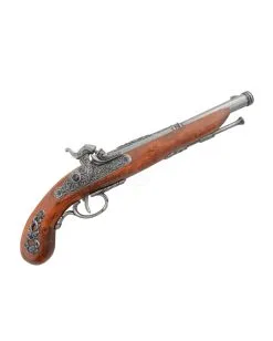 Die antike Pistole ist ein Replika aus dem 19. Jahrhundert und wurde hauptsächlich im Deutsch-Französischem Krieg der Kavallerie eingesetzt. Bei der Piraten Pistole Echtholz handelt es sich um eine Steinschloss Pistole. Die Piratenpistole ist eine ungefährliche und nicht schussfähige Dekorationswaffe als Kostümzubehör. Die detailgetreue Verarbeitung macht die Perkussions Pistole auch interessant für Sammler. Durch das Betätigen des Spannhebels und drücken des Auslösemechanismus kann ein leichtes Klickgeräusch wahrgenommen werden.