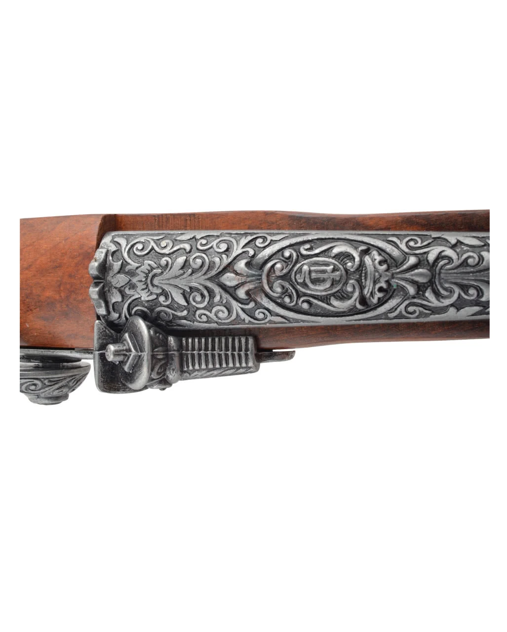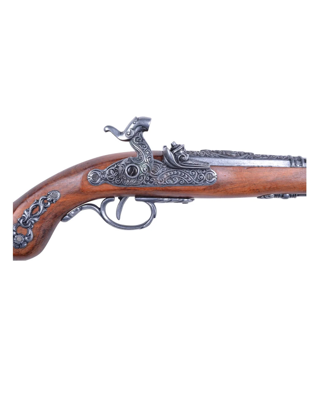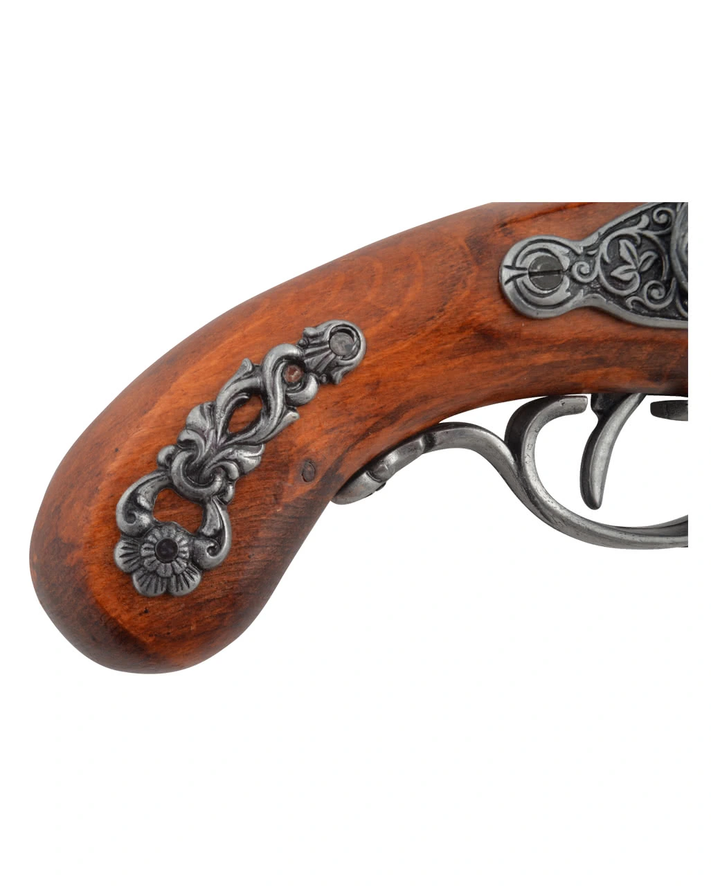 Die Steinschloss der Perkussionspistole ist in braunem Rosenholz gehalten. Das Steinschloss ist aus Metall gefertigt und mit Verzierungen aus der Zeit des 19. Jahrhunderts versehen, das die Piraten Pistole Echtholz zu einer realistisch wirkenden Steinschloss Pistole macht. Weitere Waffen Replika sind die Piraten Steinschloßpistole Echtholz und Magnum Revolver