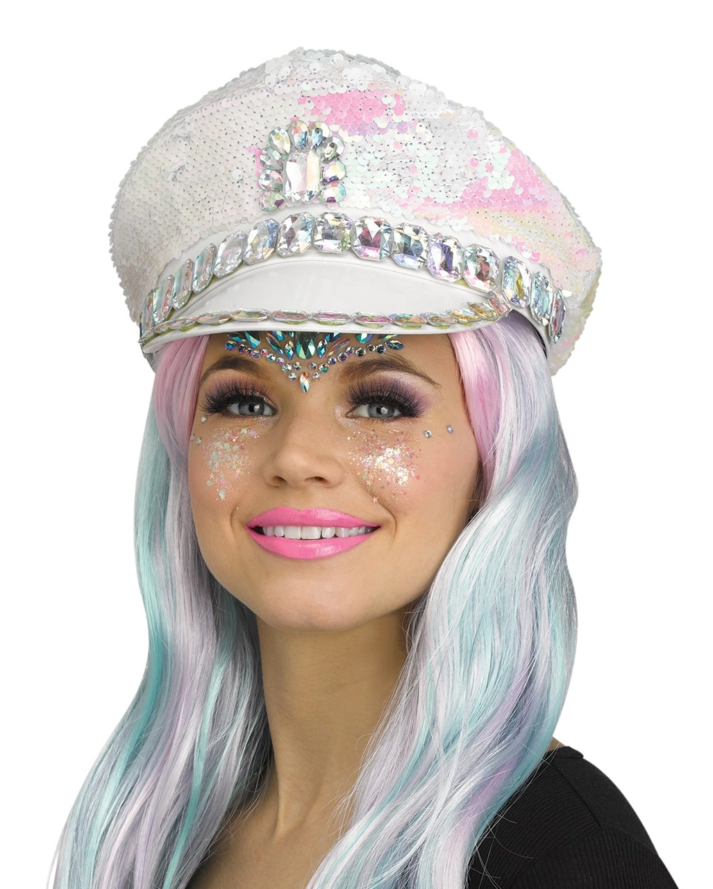 Mit der schönen Schirmmütze mit Pailletten Weiß hast du das ideale Pailletten Kostümzubehör für Karneval gefunden. Die Faschings Mütze kommt im Stil einer Schirmmütze daher und präsentiert sich mit vielen weißen Pailletten, die einen leichten rosa Farbverlauf aufweisen. Zudem befinden sich große Dekosteine an der Vorderseite der Mütze. Dieses Kostüm-Accessoire ist für alle Ladys, die mit ihrem Look gerne im Mittelpunkt stehen!