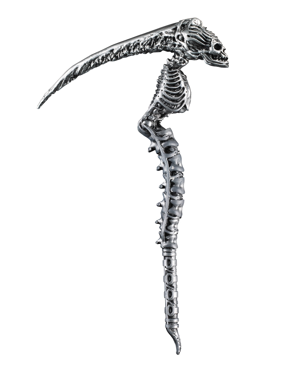 Die Skelett Cosplay Sense weist eine Größe von ca. 46 cm auf. Der Griff der Skull-Sense ist optisch einer menschlichen Wirbelsäule nachempfunden, wobei stimmige Details wie Brustkorb und Wirbel treffend eingefangen sind. Den Kopf der Gevatter-Tod-Sense bildet ein Totenschädel, dessen langgezogener Hinterkopf in die Schneide der Sense übergeht. Dazu passen die Schwarze Mönchskutte mit Kapuze und das Skelett Make Up Set.