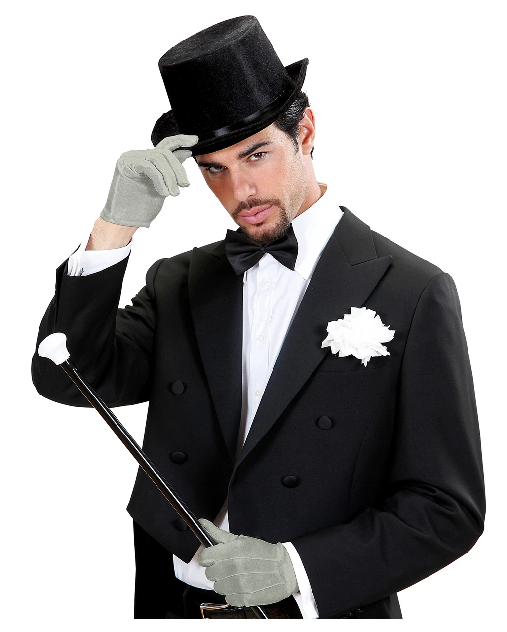 Die grauen Handschuhe sind aus Stoff , ca. 9 cm brei und ca. 23 cm lang. Sie passen sich perfekt jeder Handform an und haben ein weichen Tragekomfort. Sie lassen sich zu allen eleganten Kostümen kombinieren und machen dich zu einem echten Gentlemen. Zu deinen Handschuhen passt herrvoragend der Herren Frack weiß und Gehstock Drachenkopf