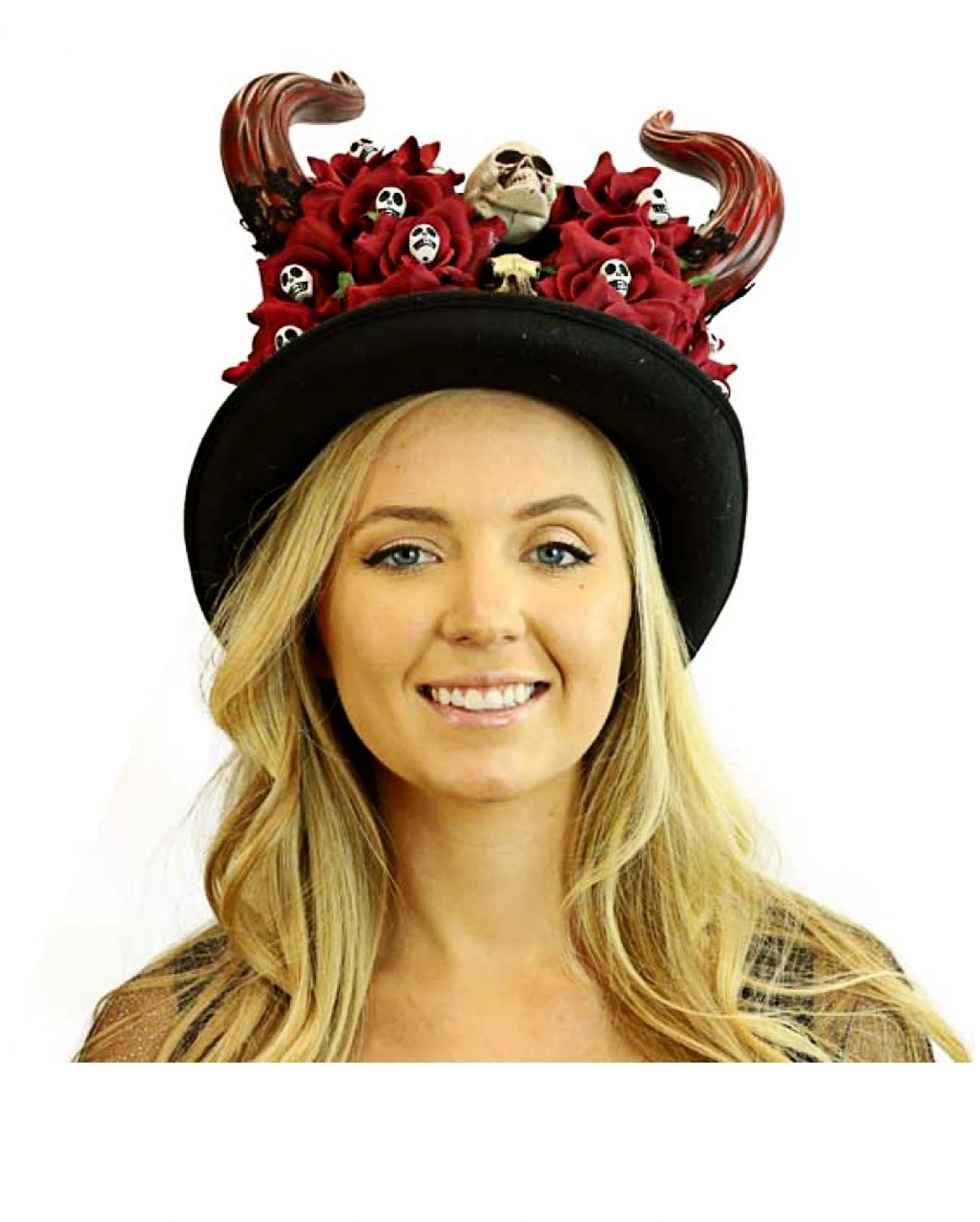 Der Tag der Toten Zylinder mit Hörner ist ein beeindruckendes Detail für deine Verkleidung zum Day of the Dead. Für die Feierlichkeiten zum Tag der Toten hast du dich extra schick gemacht. Du trägst heute deinen besten Halloween Hut, auf dem die Totenköpfe deiner Liebsten zu sehen sind. Schließlich soll man die Toten ja ehren. Deshalb umgeben die Köpfe auch eine Vielzahl an lieblichen roten Rosen. Aber nicht deshalb ist der Zylinder für den Dia de los muertos ideal. Die zwei Hörner lassen dich zu einem mystischen Wesen mit höllischem Look werden.