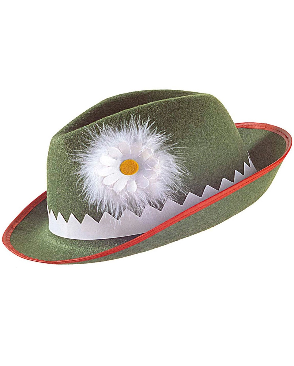 Der grüne Tirolerhut aus Filz besitzt eine Gänseblümchen Applikation mit zusätzlichem Feder-Schmuck. Der Trachtenhut ist mit einer weißen Borte im Zackenmuster verziert. Passend zu unserem Seppel Hut wären unsere Lederhosen Kostüm und für Sie das Sexy Heidi Kostüm Medium